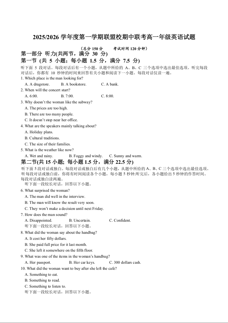 江苏省盐城市五校2025-2026学年高一上学期期中联考试题 英语试卷(含答案).docx