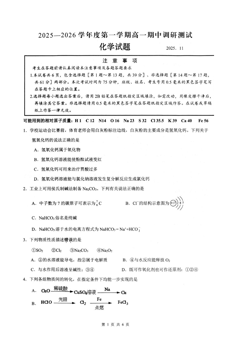 江苏省扬州市高邮市2025-2026学年高一上学期期中考试 化学试题(含答案).pdf