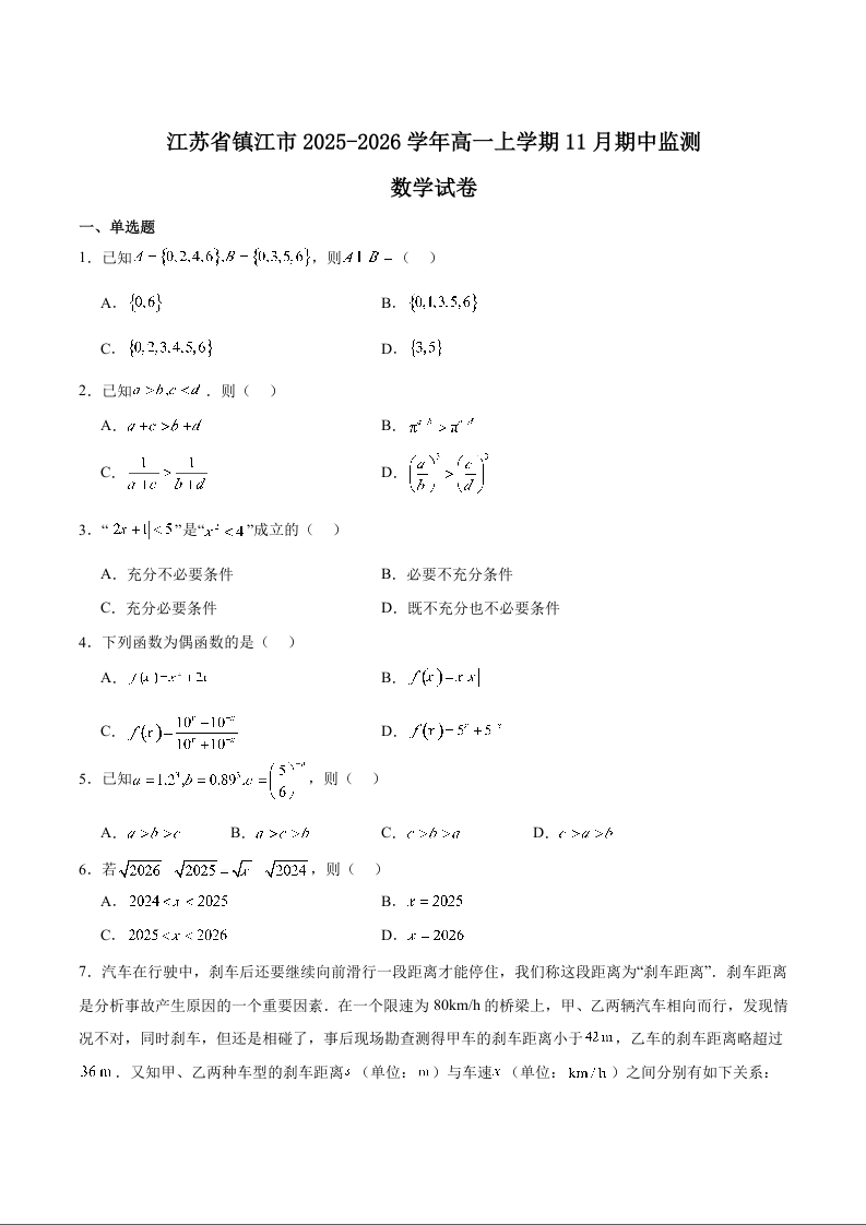 江苏省镇江市2025-2026学年高一上学期期中质量监测 数学试题(含答案).docx