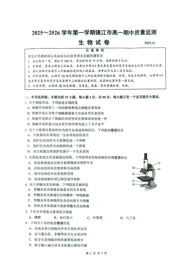 江苏省镇江市2025-2026学年高一上学期期中质量监测 生物试题(含答案).pdf
