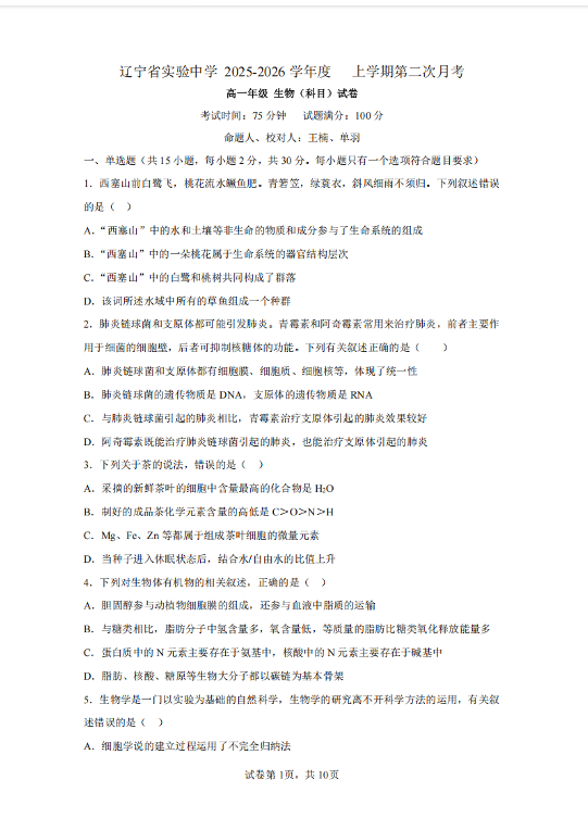 辽宁省实验中学2028届高一年级12月份阶段测试 生物试题(含答案).pdf