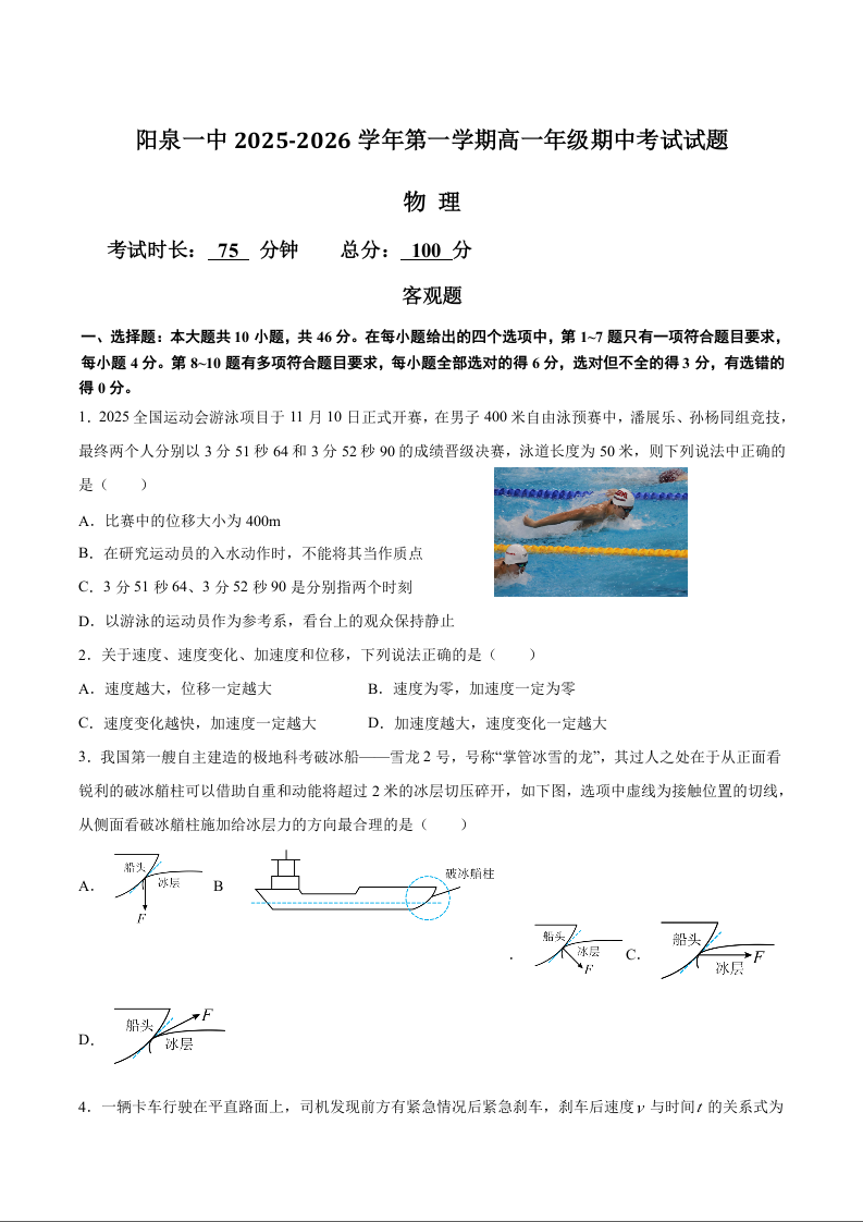 山西省阳泉市第一中学校2025-2026学年高一上学期期中考试 物理试题(含答案).docx