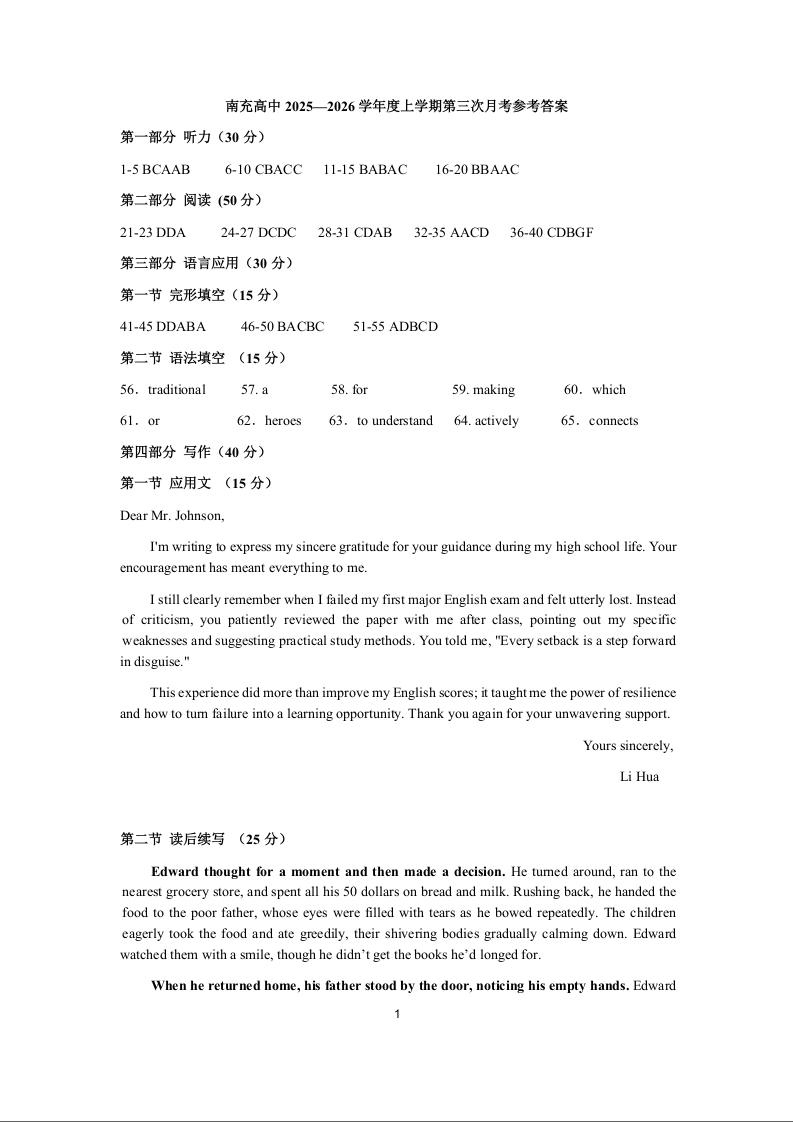 南充高中高2025级高一上学期第二次月考 英语答案.docx