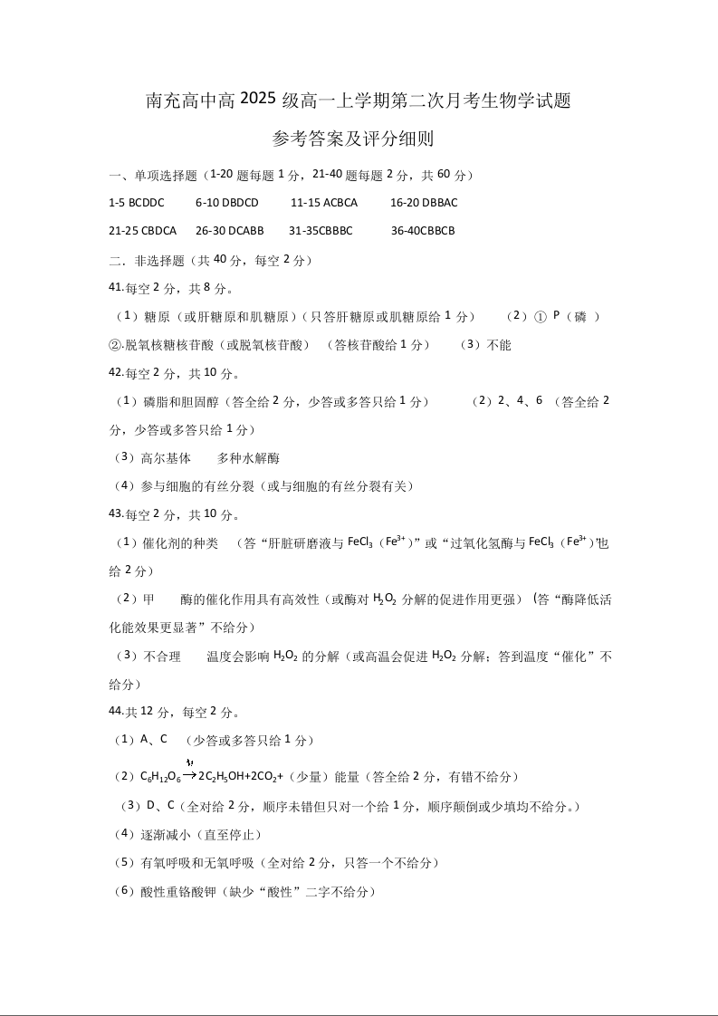 南充高中高2025级高一上学期第二次月考 生物答案.docx