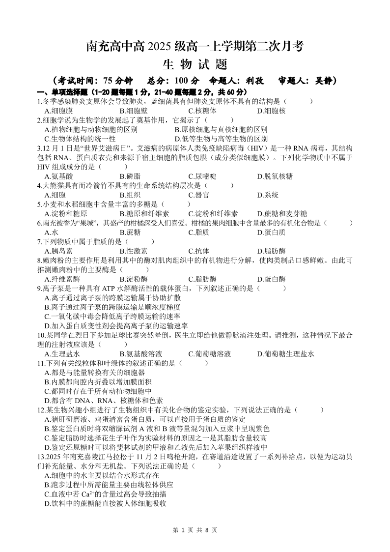 南充高中高2025级高一上学期第二次月考 生物.pdf