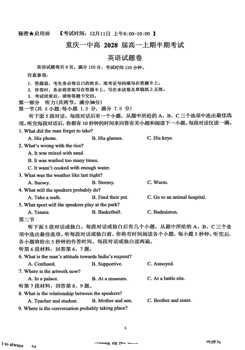 重庆市第一中学校2025-2026学年高一上学期12月期中考试 英语试题(含答案).pdf