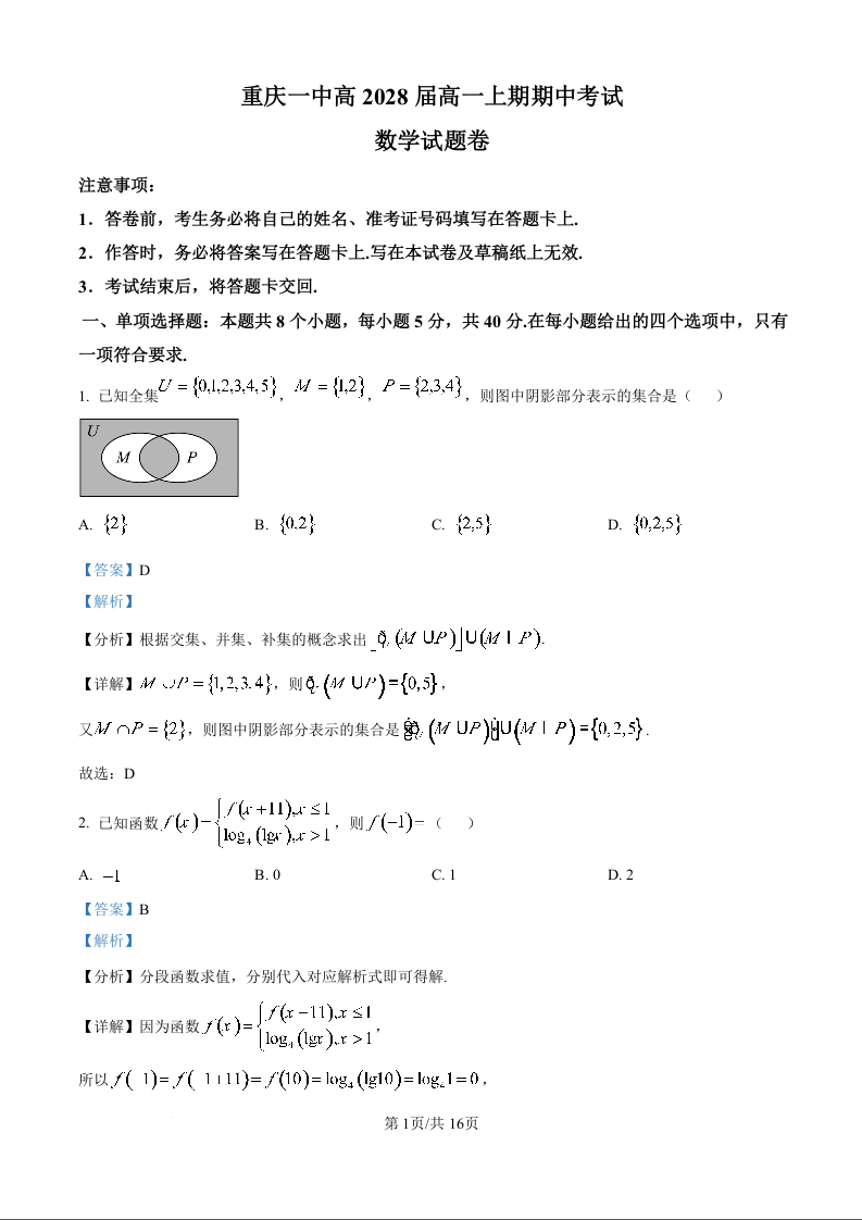 重庆市第一中学校2025-2026学年高一上学期12月期中考试 数学答案.docx