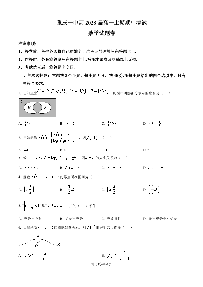 重庆市第一中学校2025-2026学年高一上学期12月期中考试 数学.docx