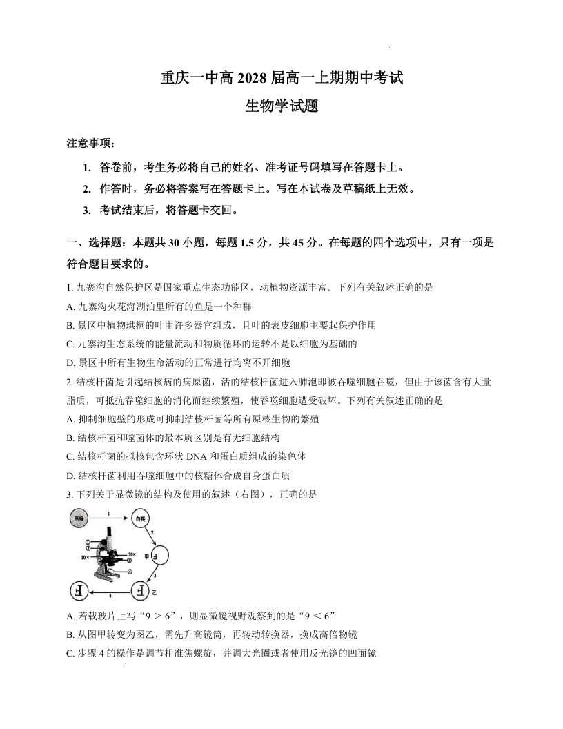 重庆市第一中学校2025-2026学年高一上学期12月期中考试 生物试题(含答案).docx
