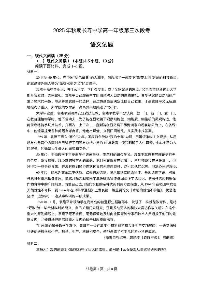 重庆市长寿中学校2025-2026学年高一上学期12月月考 语文试题(含答案).pdf