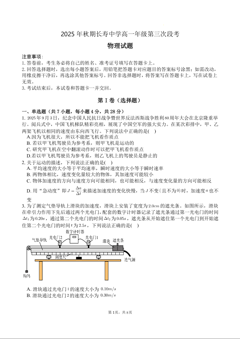 重庆市长寿中学校2025-2026学年高一上学期12月月考 物理试题(含答案).docx