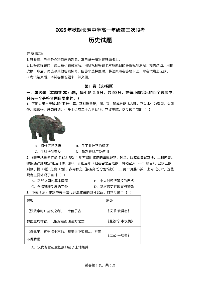 重庆市长寿中学校2025-2026学年高一上学期12月月考 历史试题(含答案).pdf