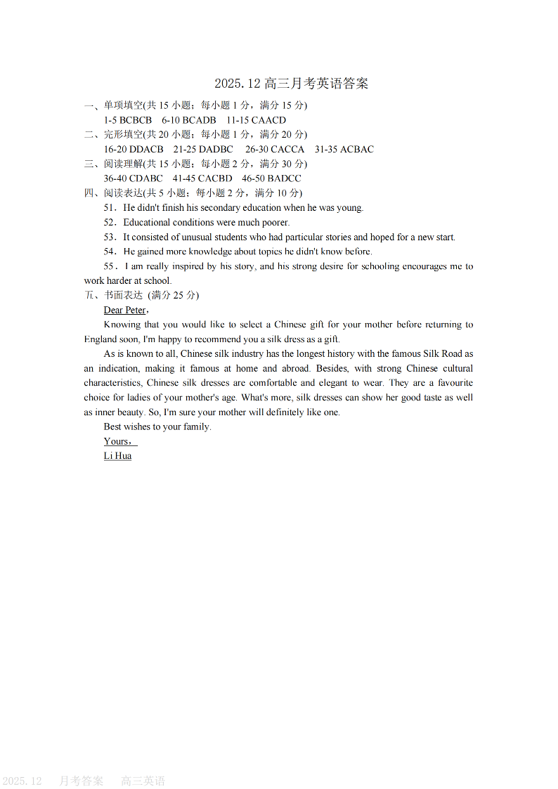 天津市第三中学2025-2026学年度第一学期高三年级12月阶段性检测 英语答案.pdf