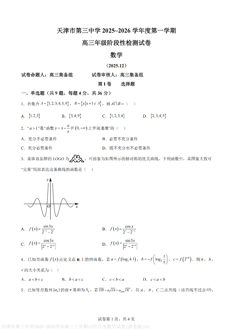 天津市第三中学2025-2026学年度第一学期高三年级12月阶段性检测 数学.pdf