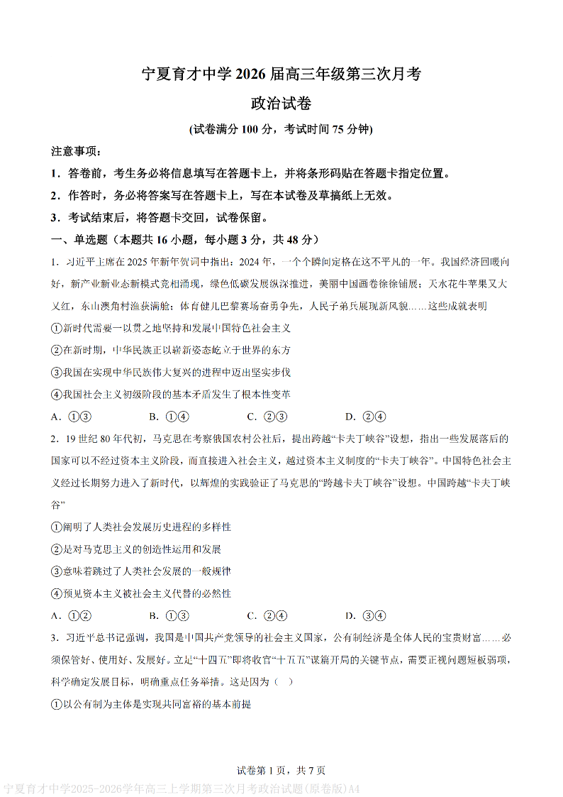 宁夏育才中学2026届高三年级第三次月考 政治.pdf