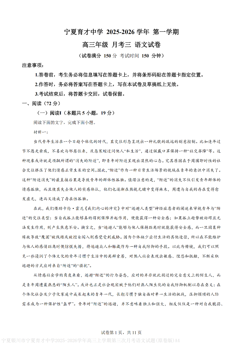 宁夏育才中学2026届高三年级第三次月考 语文.pdf