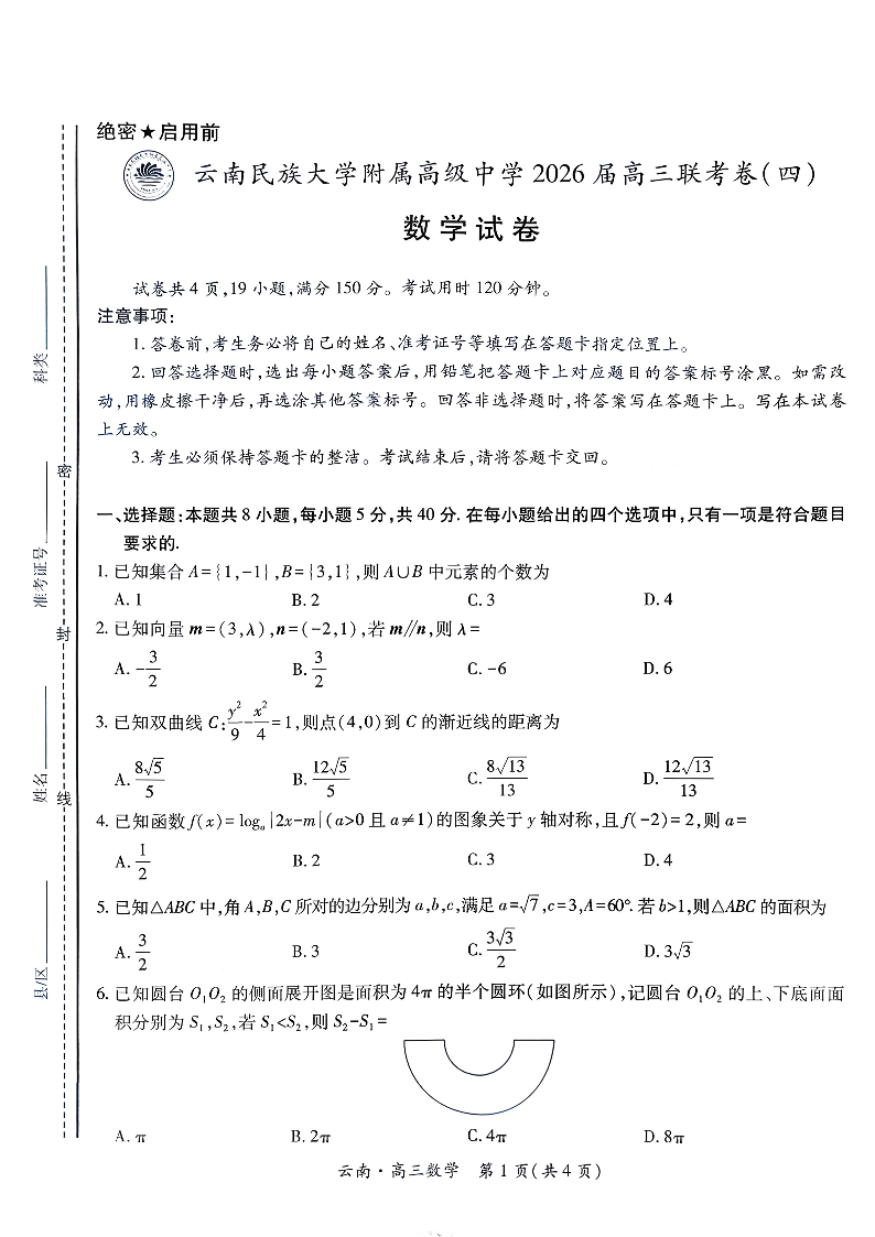 云南民族大学附属高级中学2026届高三联考卷(四)数学试题(含答案).pdf