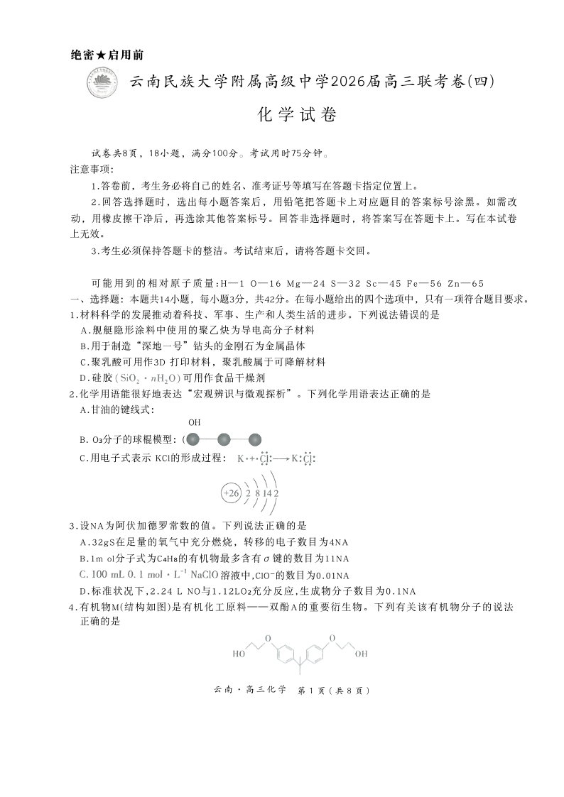 云南民族大学附属高级中学2026届高三联考卷(四)化学试题(含答案).pdf