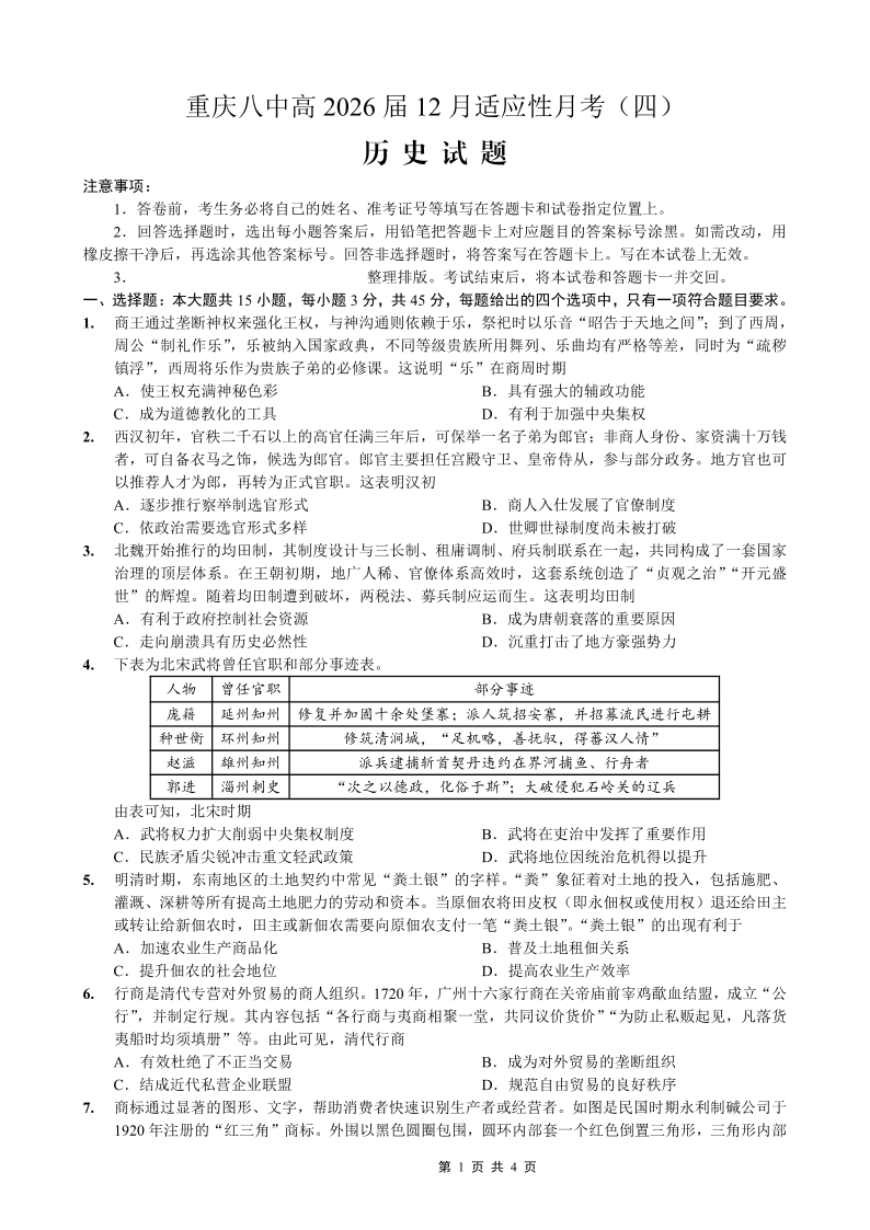 重庆市第八中学2026届高考适应性月考卷(四)历史.pdf