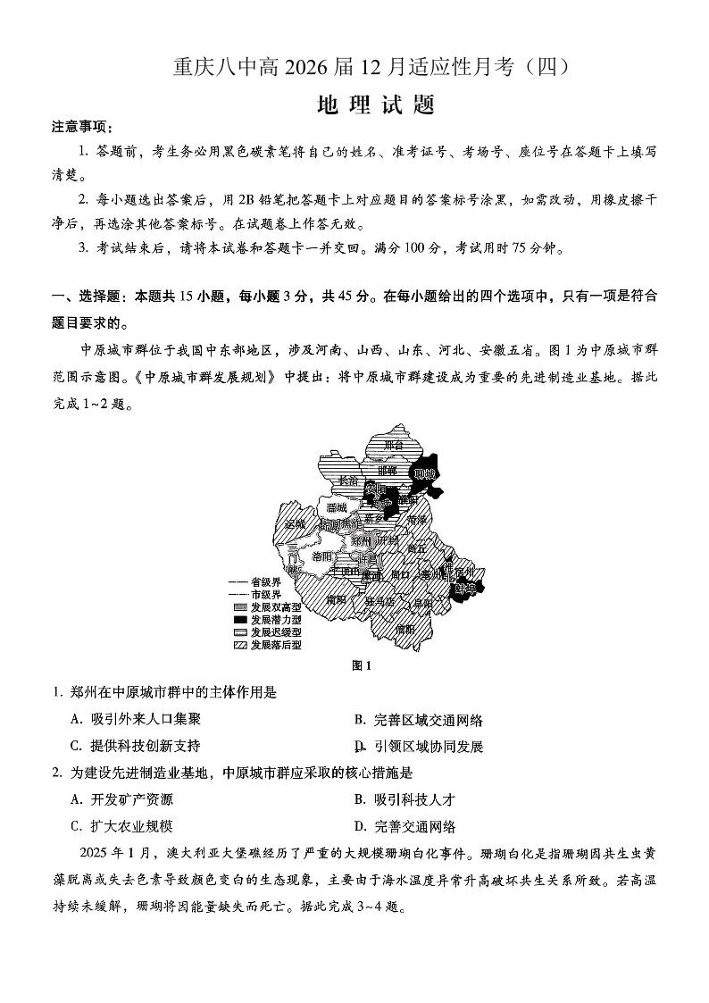 重庆市第八中学2026届高考适应性月考卷(四)地理.pdf