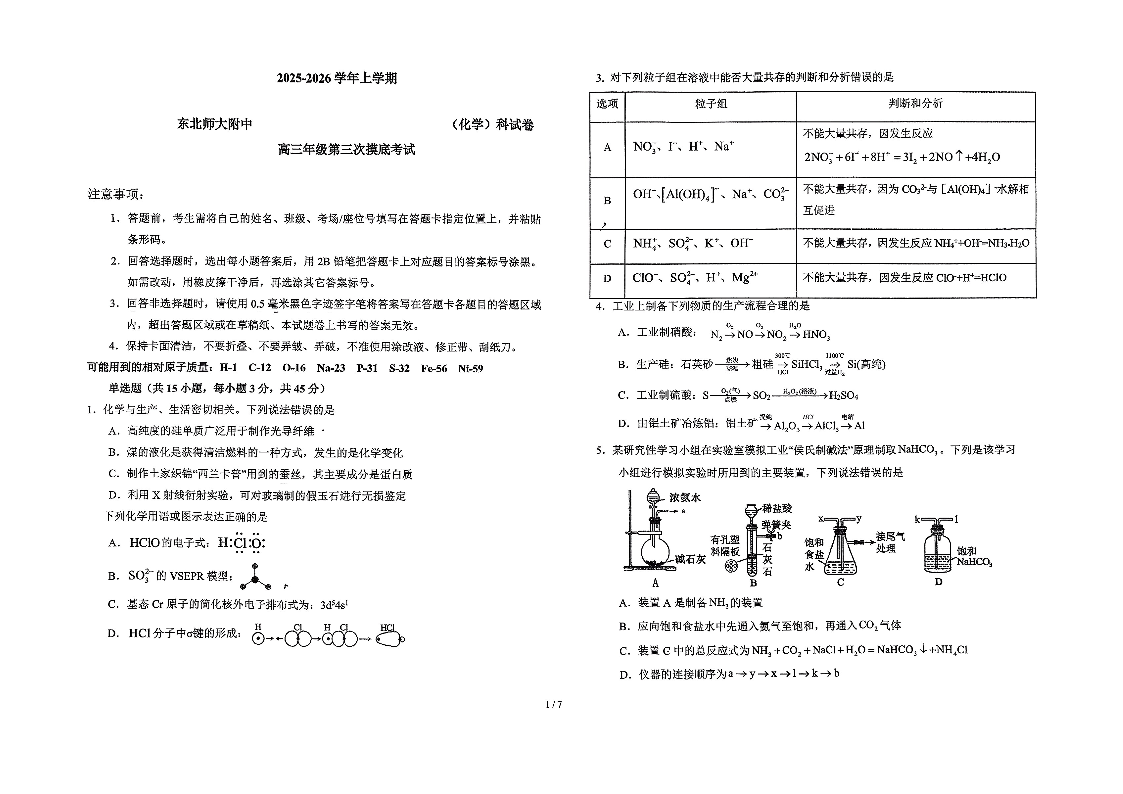 东北师大附中2025-2026学年上学期高三年级第三次摸底考试 化学.pdf