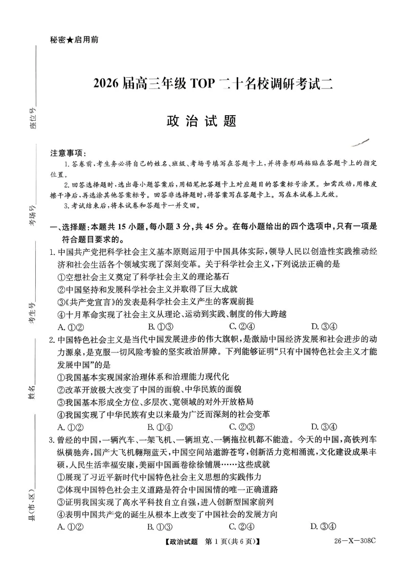 河南省2026届高三年级TOP二十名校调研考试二 政治.pdf