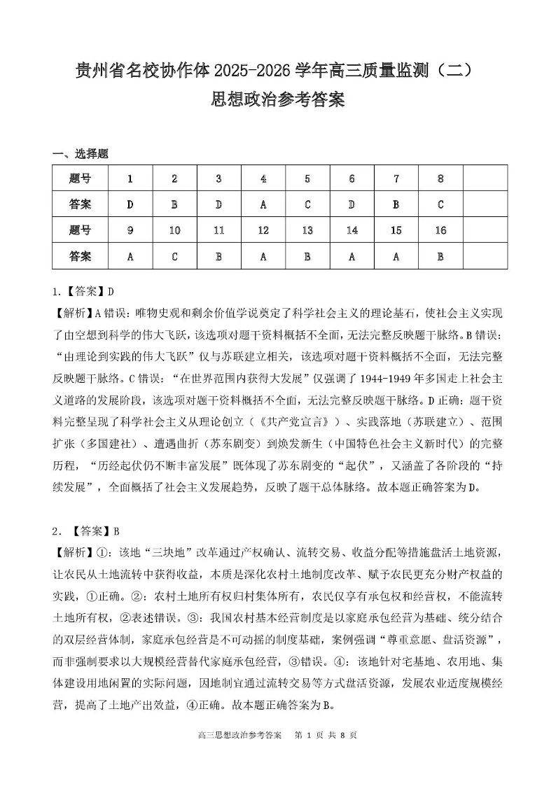 贵州省名校协作体2025-2026学年高三质量监测(二)政治答案.pdf