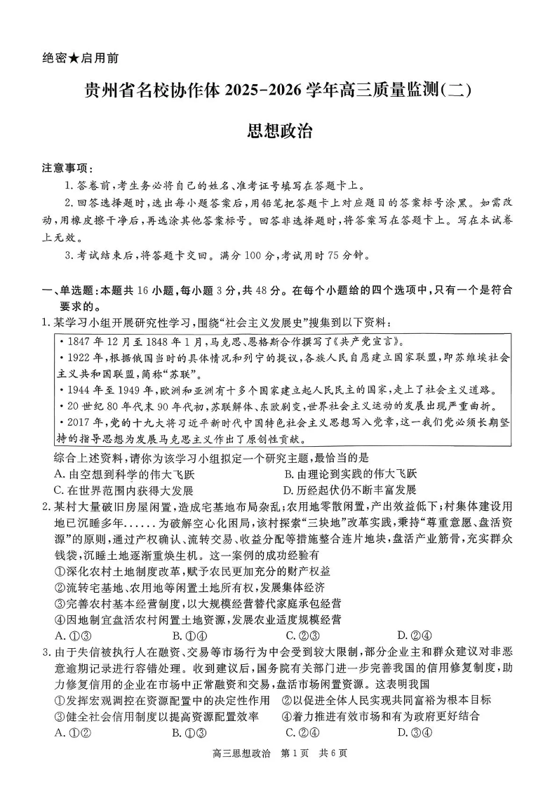 贵州省名校协作体2025-2026学年高三质量监测(二)政治.pdf
