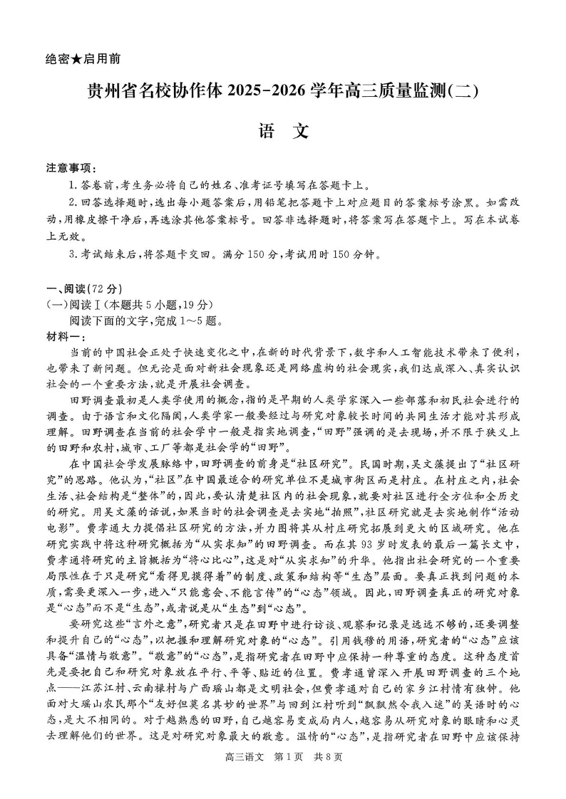 贵州省名校协作体2025-2026学年高三质量监测(二)语文.pdf