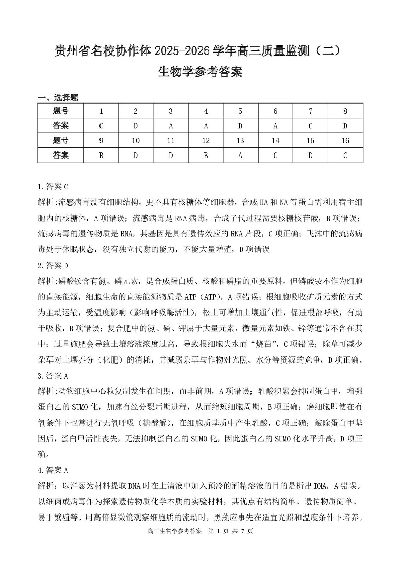 贵州省名校协作体2025-2026学年高三质量监测(二)生物答案.pdf