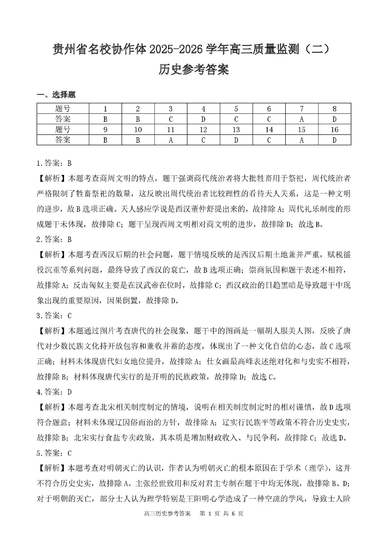 贵州省名校协作体2025-2026学年高三质量监测(二)历史答案.pdf