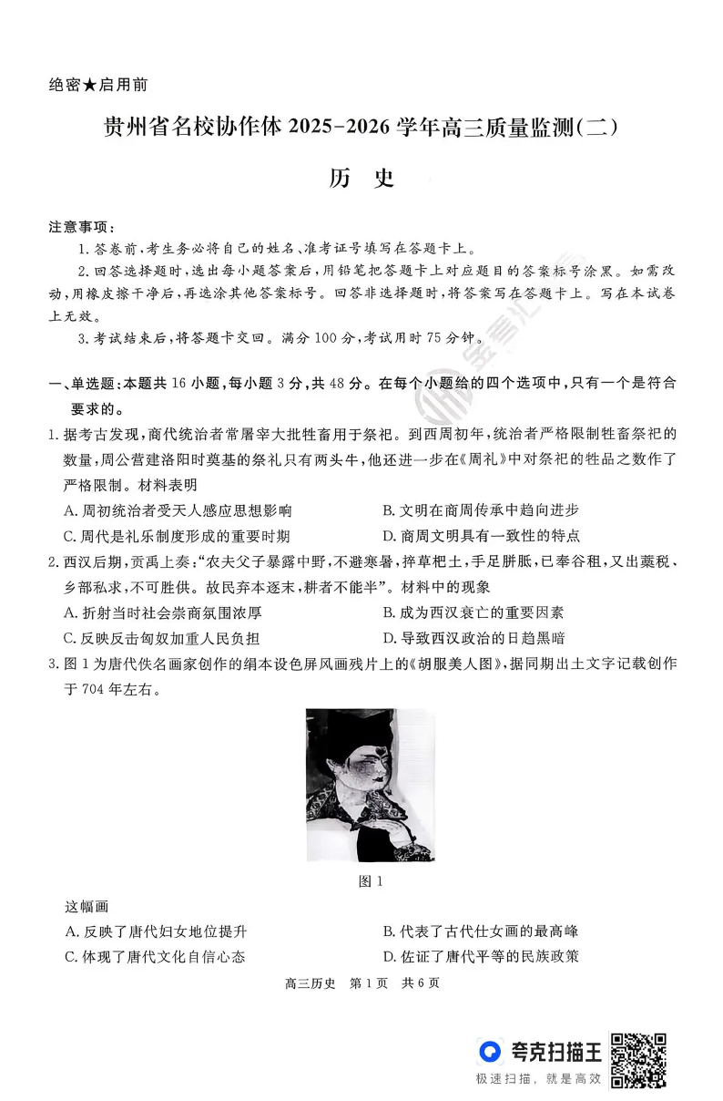 贵州省名校协作体2025-2026学年高三质量监测(二)历史.pdf