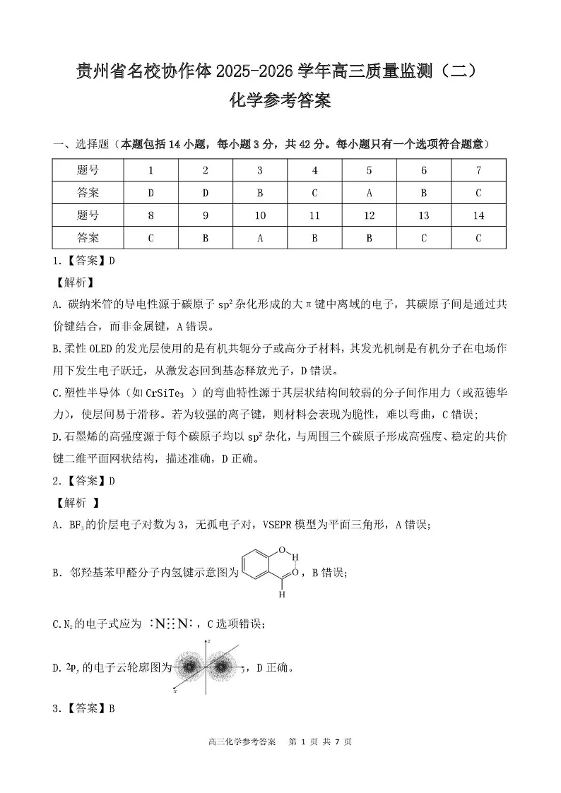 贵州省名校协作体2025-2026学年高三质量监测(二)化学答案.pdf