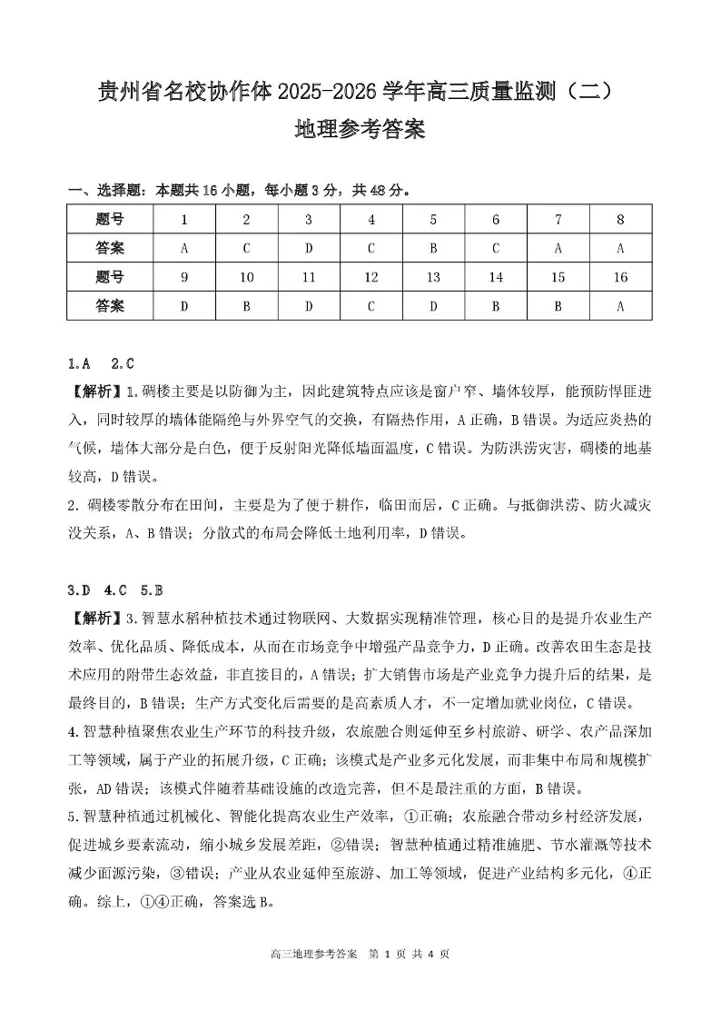 贵州省名校协作体2025-2026学年高三质量监测(二)地理答案.pdf