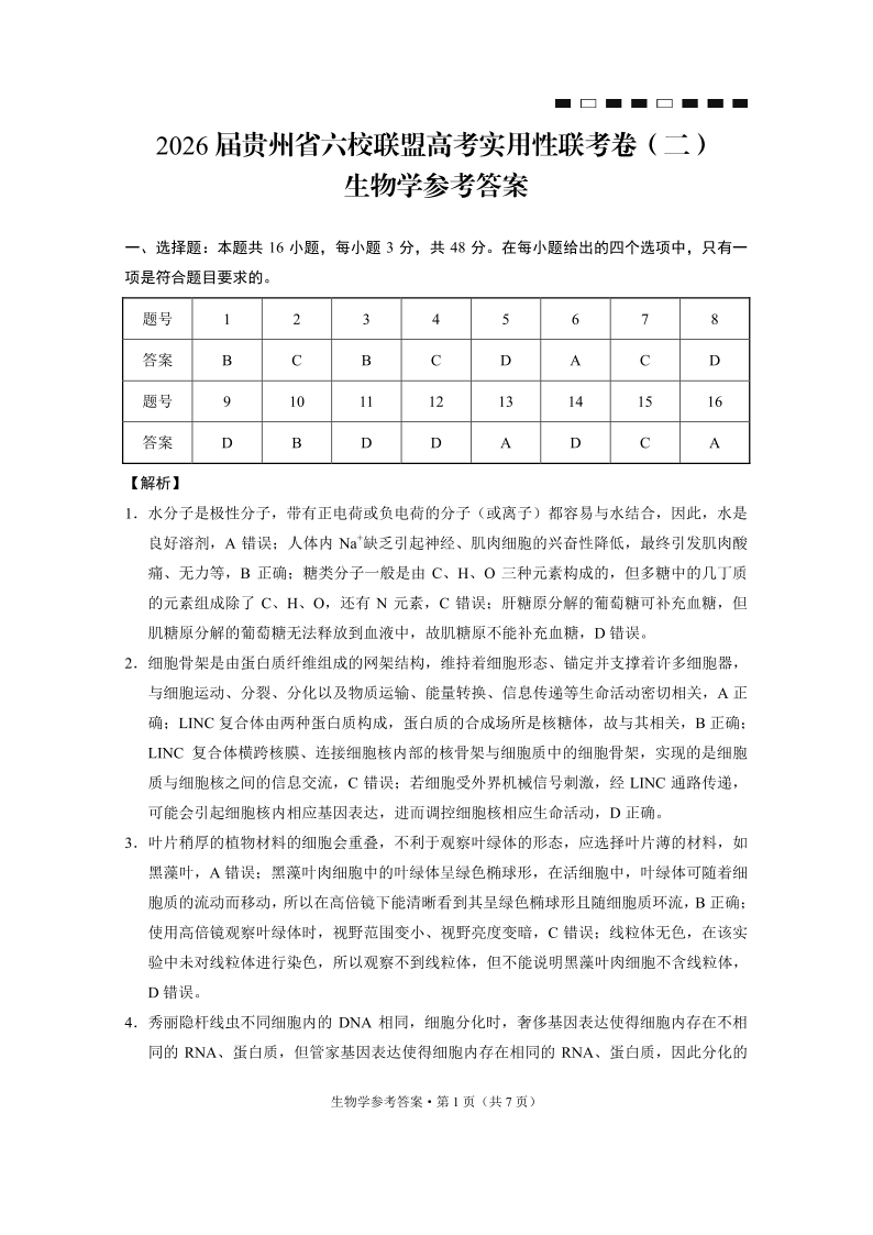 贵州省六校联盟2026届高三上学期高考实用性联考卷(二)生物答案.pdf