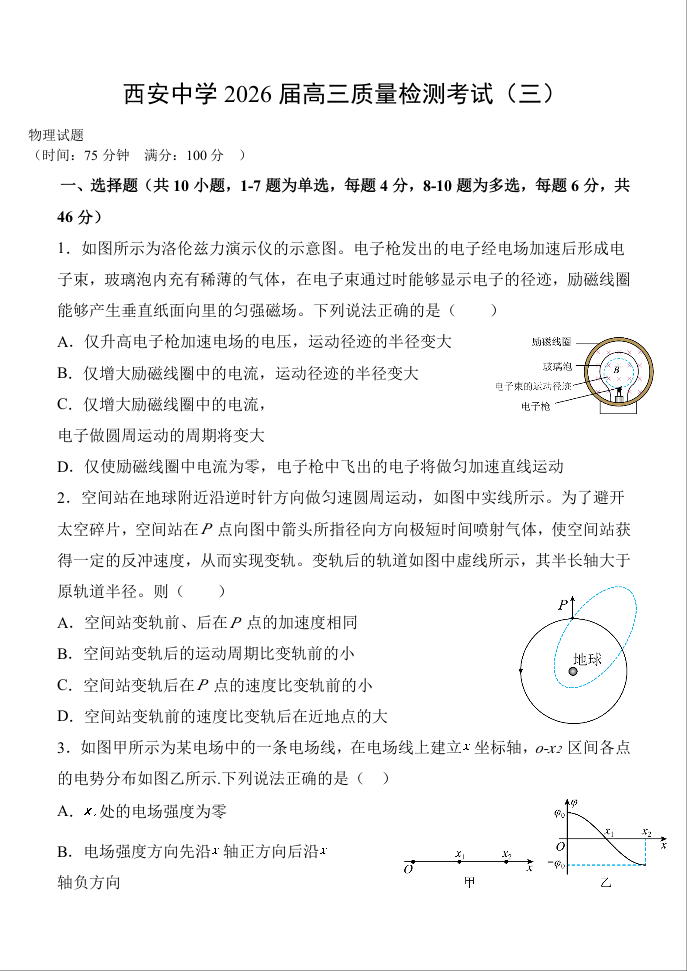 西安中学2026届高三质量检测考试(三)物理.docx