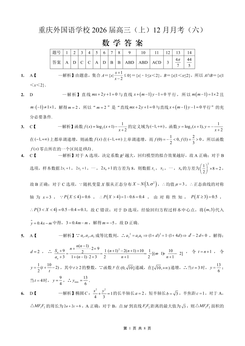 重庆外国语学校高2026届高三(上)12月月考(六)数学答案.pdf