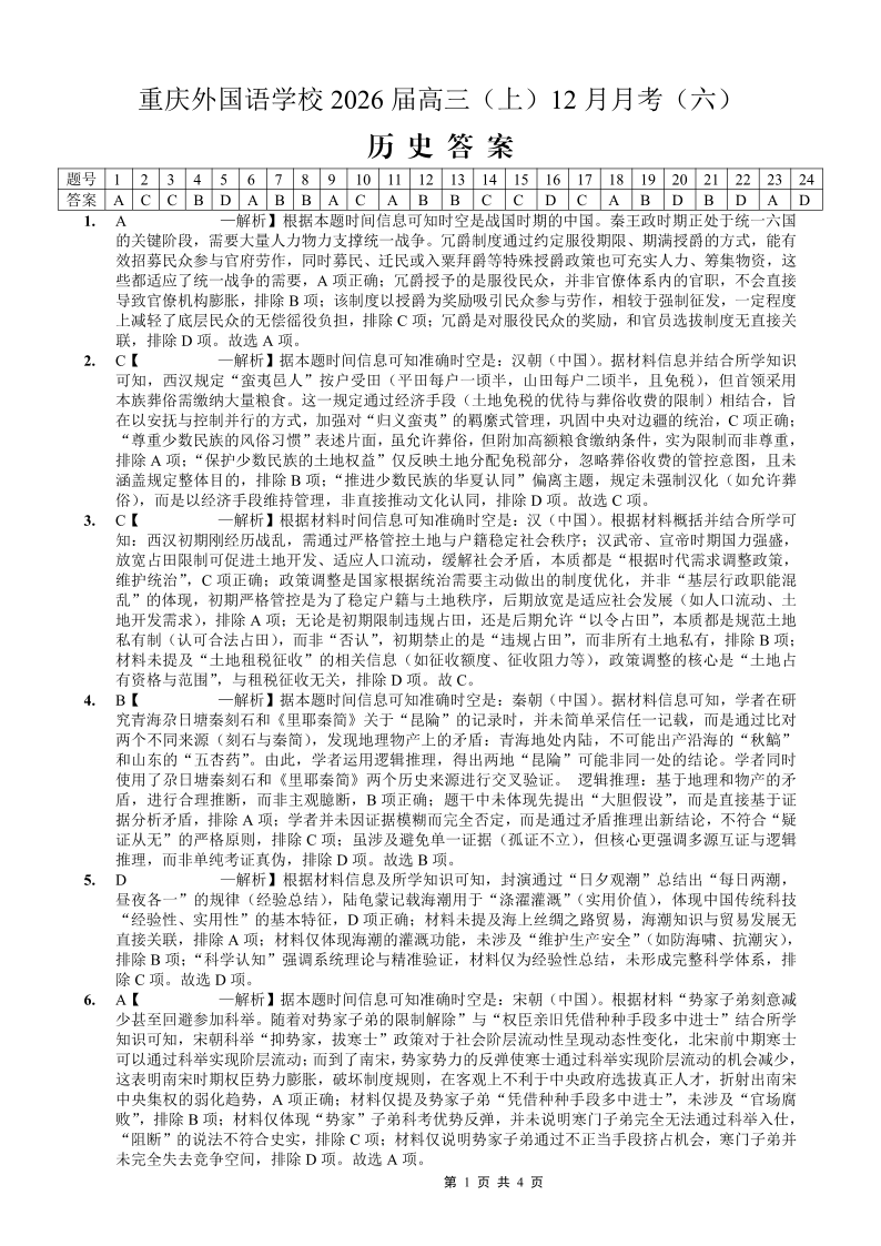 重庆外国语学校高2026届高三(上)12月月考(六)历史答案.pdf