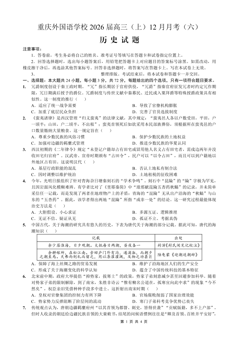 重庆外国语学校高2026届高三(上)12月月考(六)历史.pdf