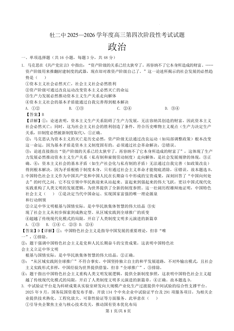 牡丹江市第二高级中学2026届高三第四次阶段性考试 政治答案.docx