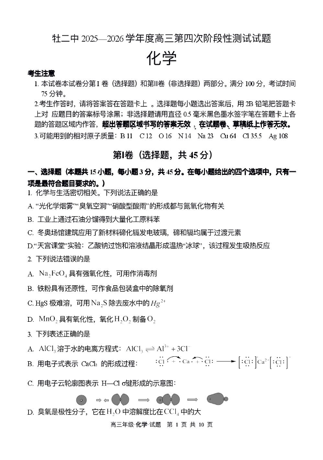 牡丹江市第二高级中学2026届高三第四次阶段性考试 化学.pdf