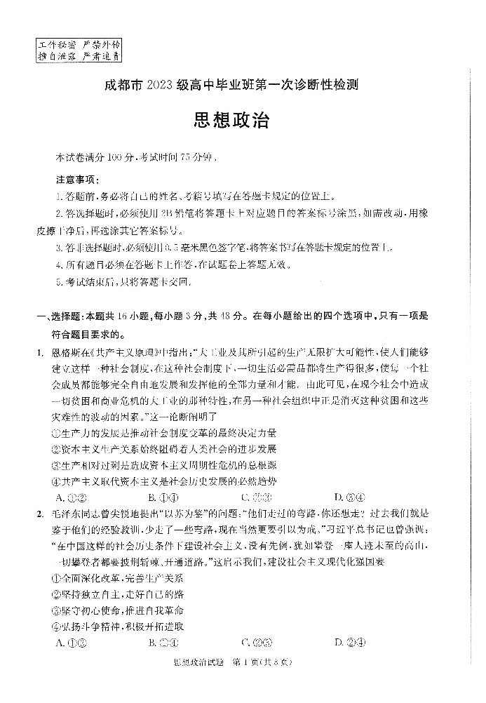 成都市2023级高中毕业班第一次诊断性检测 政治.pdf