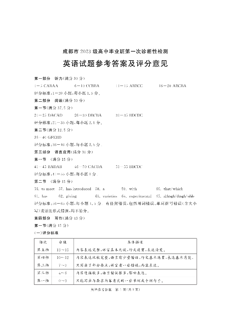 成都市2023级高中毕业班第一次诊断性检测 英语答案.pdf