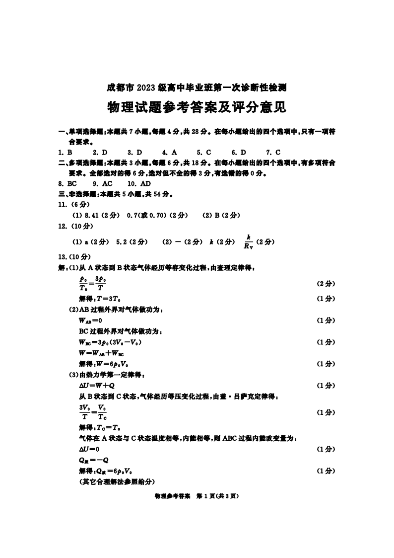 成都市2023级高中毕业班第一次诊断性检测 物理答案.pdf