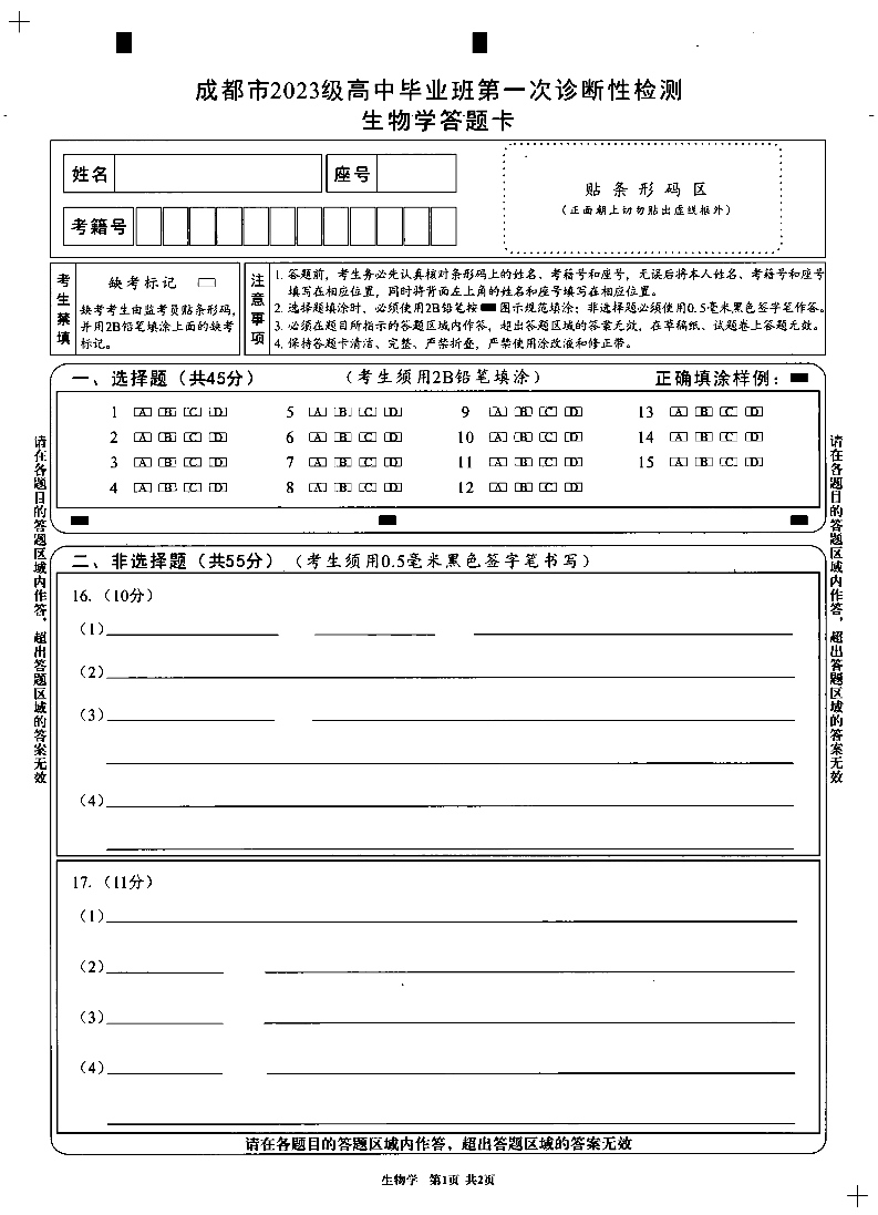 成都市2023级高中毕业班第一次诊断性检测 生物答题卡.pdf