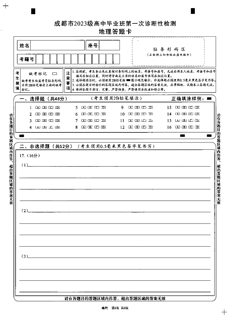 成都市2023级高中毕业班第一次诊断性检测 地理答题卡.pdf