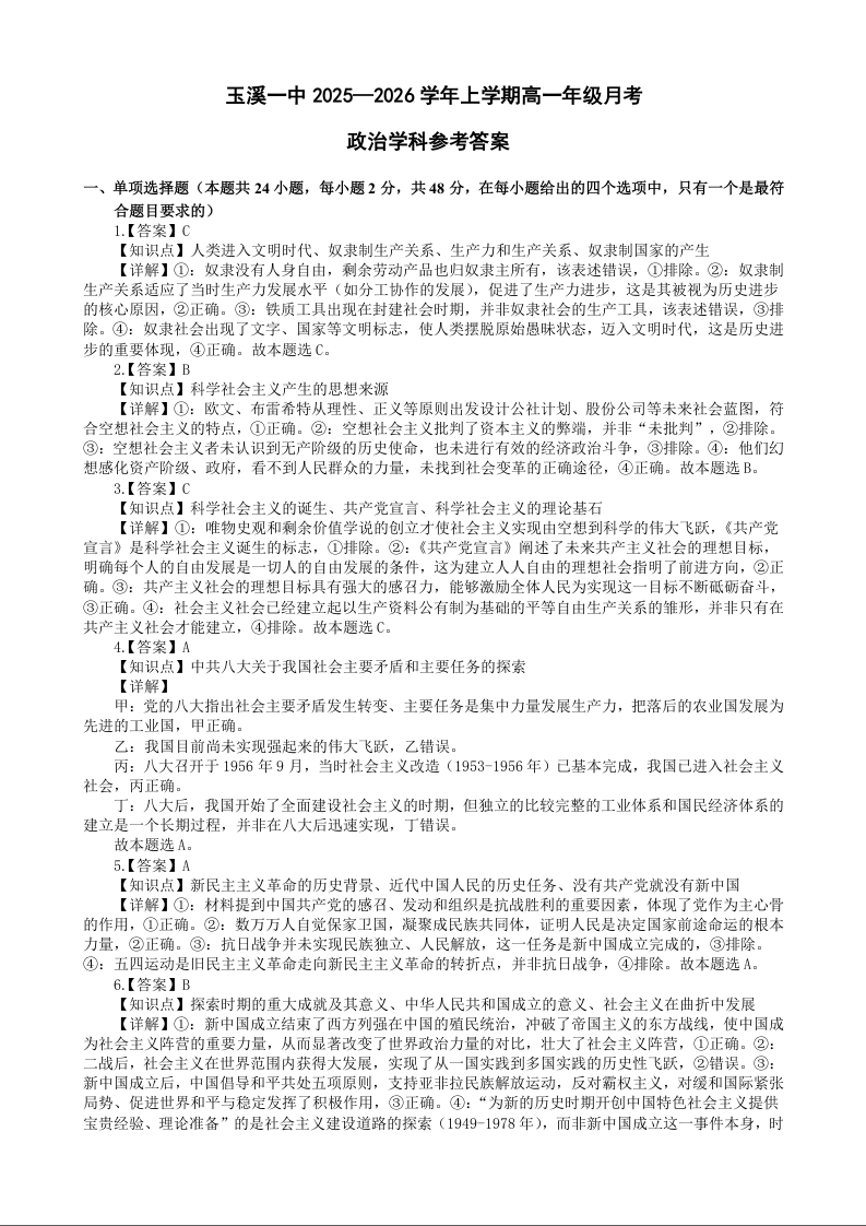 玉溪一中2025-2026学年高一上学期第二次月考 政治答案.docx