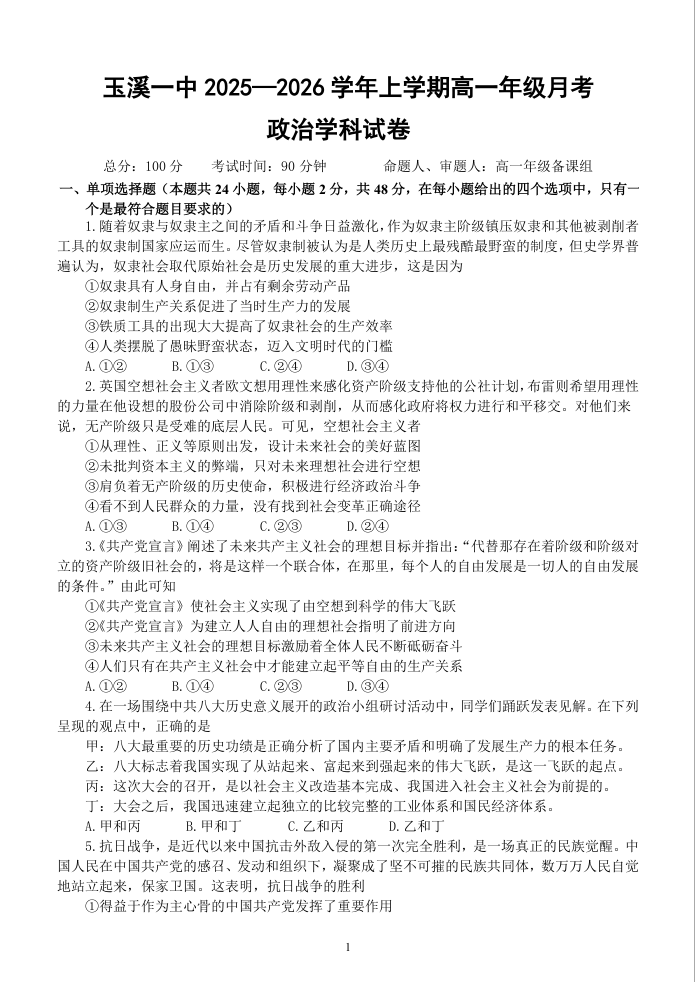 玉溪一中2025-2026学年高一上学期第二次月考 政治.docx