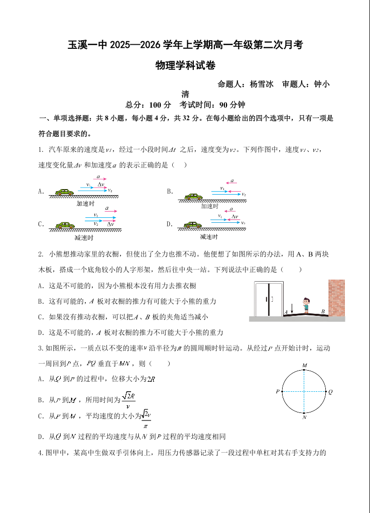 玉溪一中2025-2026学年高一上学期第二次月考 物理.docx