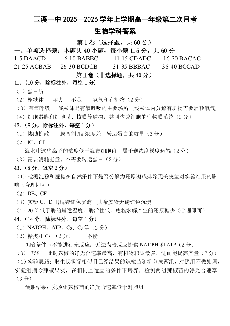 玉溪一中2025-2026学年高一上学期第二次月考 生物答案.docx